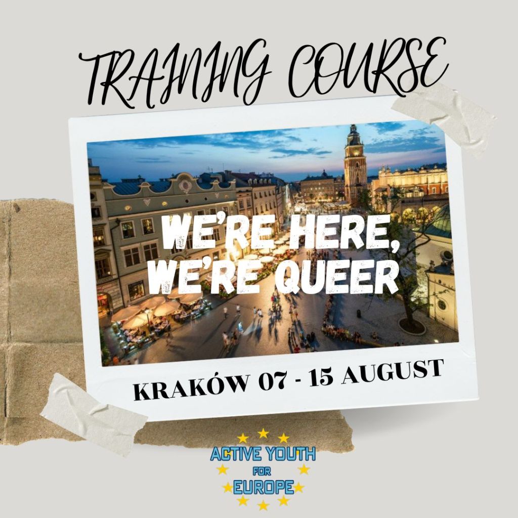 L’associazione “Active Youth for Europe” è alla ricerca di 5 partecipanti maggiorenni residenti in Italia per il Training Course “We’re here, we’re queer” che si terrà a Cracovia – Polonia, dal 07 al 15 Agosto 2023.